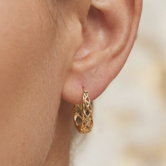 Transform your look into one of sheer elegance with our Adele twisted net oval hoop earrings. Created with top-quality sterling silver and expertly coated in 18k gold, these hoops exude a luxurious shine. Add a touch of uniqueness and glamour to any outfit with these stunning earrings.