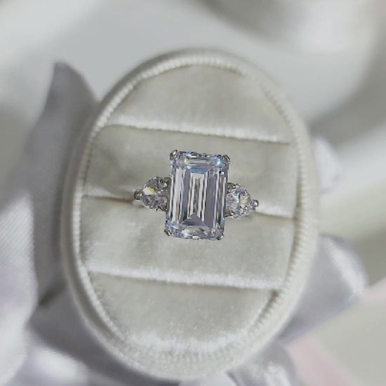 The Amanda clear cubic zirconia emerald cut three stone ring is a stunning symbol of eternal love, meticulously crafted from genuine sterling silver and rhodium plated. Its timeless and romantic design makes it the perfect way to commemorate a special love. With its combination of sophistication and heartfelt sentiment, this three stone ring is a top pick, making it a truly elegant way to honor your special moment.