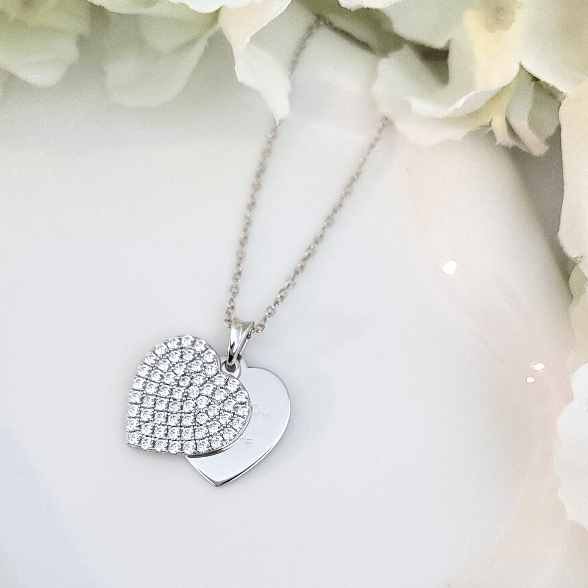 The ANGELIQUE "I Love You Deeply" Double Heart Pave Pendant Necklace features an exclusive and unique design, highlighted by a beautiful pave heart that naturally draws attention. Thoughtfully crafted, the fully finished back provides a smooth, polished finish that distinguishes it from typical pave pendants with small holes. The second heart carries a meaningful, uplifting secret message to keep close to your heart. This faith-inspiring necklace gracefully blends inspiration with style, empowering you to radiate confidence without compromising elegance. Its adjustable length lets you choose between a stylish choker or a sophisticated longer necklace. The perfect gift to pamper yourself or to surprise a loved one, this necklace is sure to make a statement and draw compliments wherever you go.