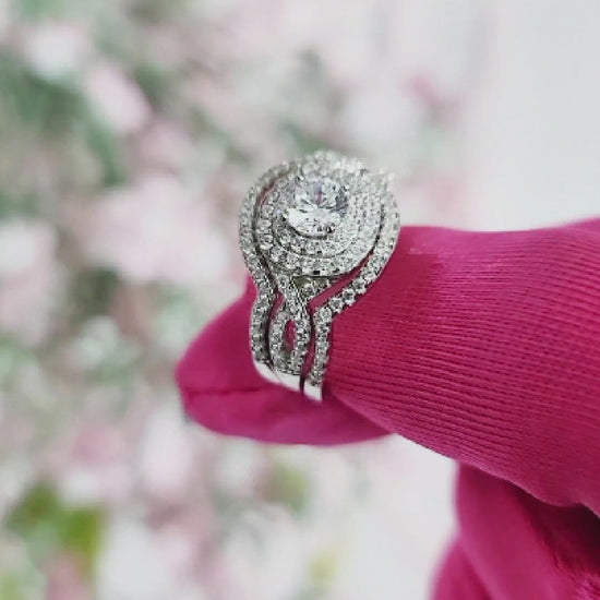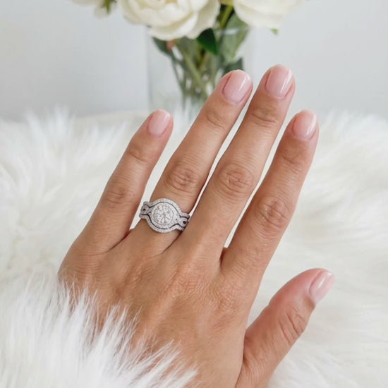 BETTY White CZ Diamond Halo Round Bridal Ring Set in Rhodium Over Sterling Silver