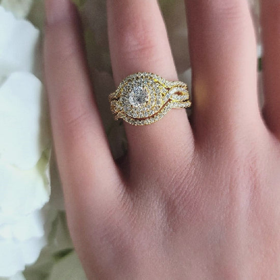 Experience the ultimate luxury with compliments galore! Give yourself the gift of ultimate luxury with endless compliments and impeccable style! The Betty halo round stacking rings feature mesmerizing halo round accents and are plated in 14K gold exuding timeless elegance fit for a queen. Add a touch of elegance to any ensemble and exude confidence with the Betty halo round bridal stacking set rings!