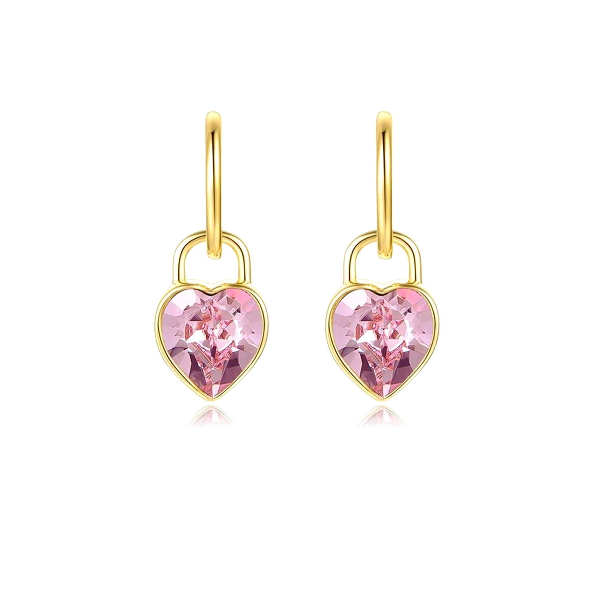 Dress up any outfit with these stunning earrings! The delicate pink heart crystal adds a touch of romance and femininity, while the 14K gold plating adds a luxurious shine. The versatile Clara earrings can be worn as elegant drop earrings with charming pink hearts, or as simple gold hoops when the detachable part is removed. These Clara earrings are perfect for a date night or adding a touch of glamour to your everyday look. Elevate your look and treat yourself or someone special to these gorgeous earrings!