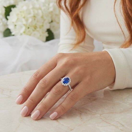 DIANA Oval Blue Sapphire Halo Ring in Rhodium Over Sterling Silver