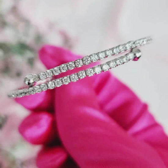 The ELLA Bangle Tennis Bracelet in sterling silver is lightweight and combines delicate design with dazzling sparkle, featuring a sleek 2 mm flexible band adorned with diamond simulant gemstones. Rhodium plating enhances the sterling silver's durability and provides a radiant finish. This versatile piece complements any outfit, adding a touch of sophistication whether worn alone or stacked with other bracelets. Perfect for both daily elegance and special occasions, the ELLA bracelet delivers lasting shine and style, making it an essential addition to your jewelry collection.