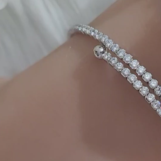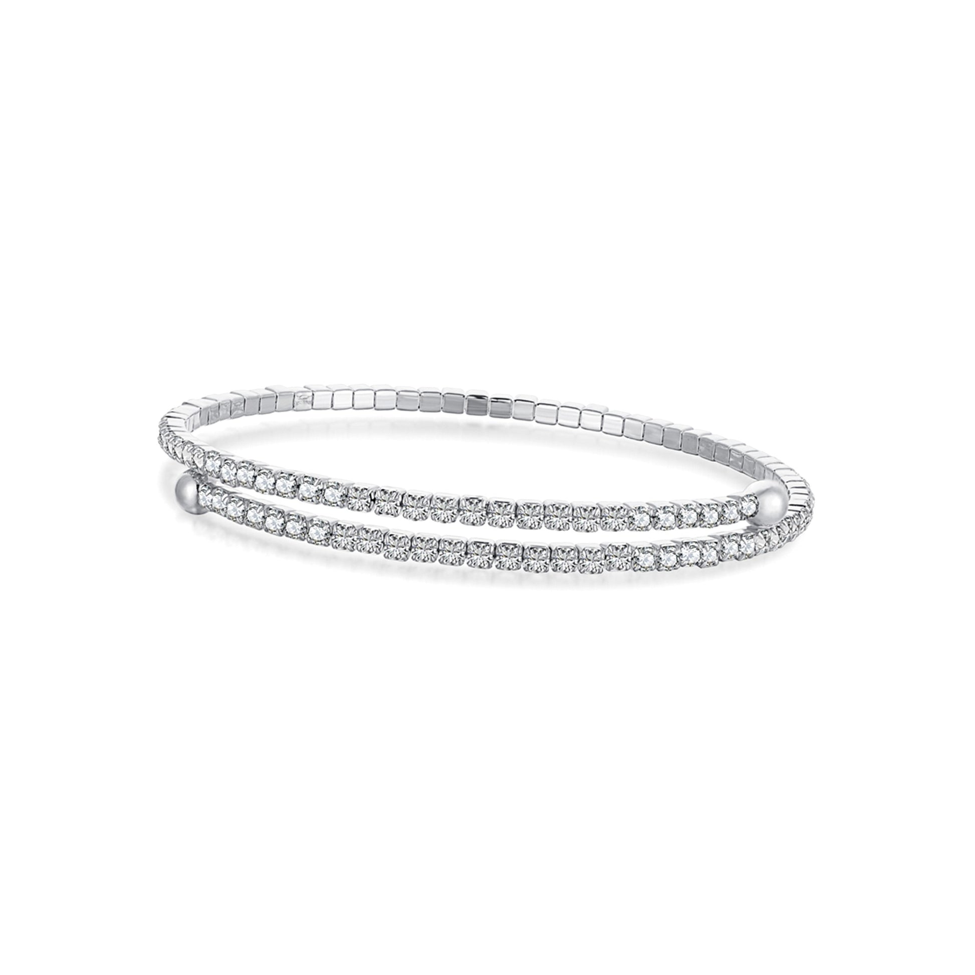 The ELLA Bangle Tennis Bracelet in sterling silver is lightweight and combines delicate design with dazzling sparkle, featuring a sleek 2 mm flexible band adorned with diamond simulant gemstones. Rhodium plating enhances the sterling silver's durability and provides a radiant finish. This versatile piece complements any outfit, adding a touch of sophistication whether worn alone or stacked with other bracelets. Perfect for both daily elegance and special occasions, the ELLA bracelet delivers lasting shine and style, making it an essential addition to your jewelry collection.