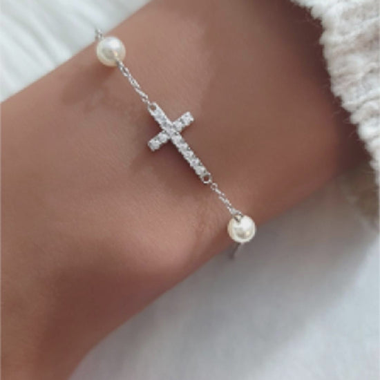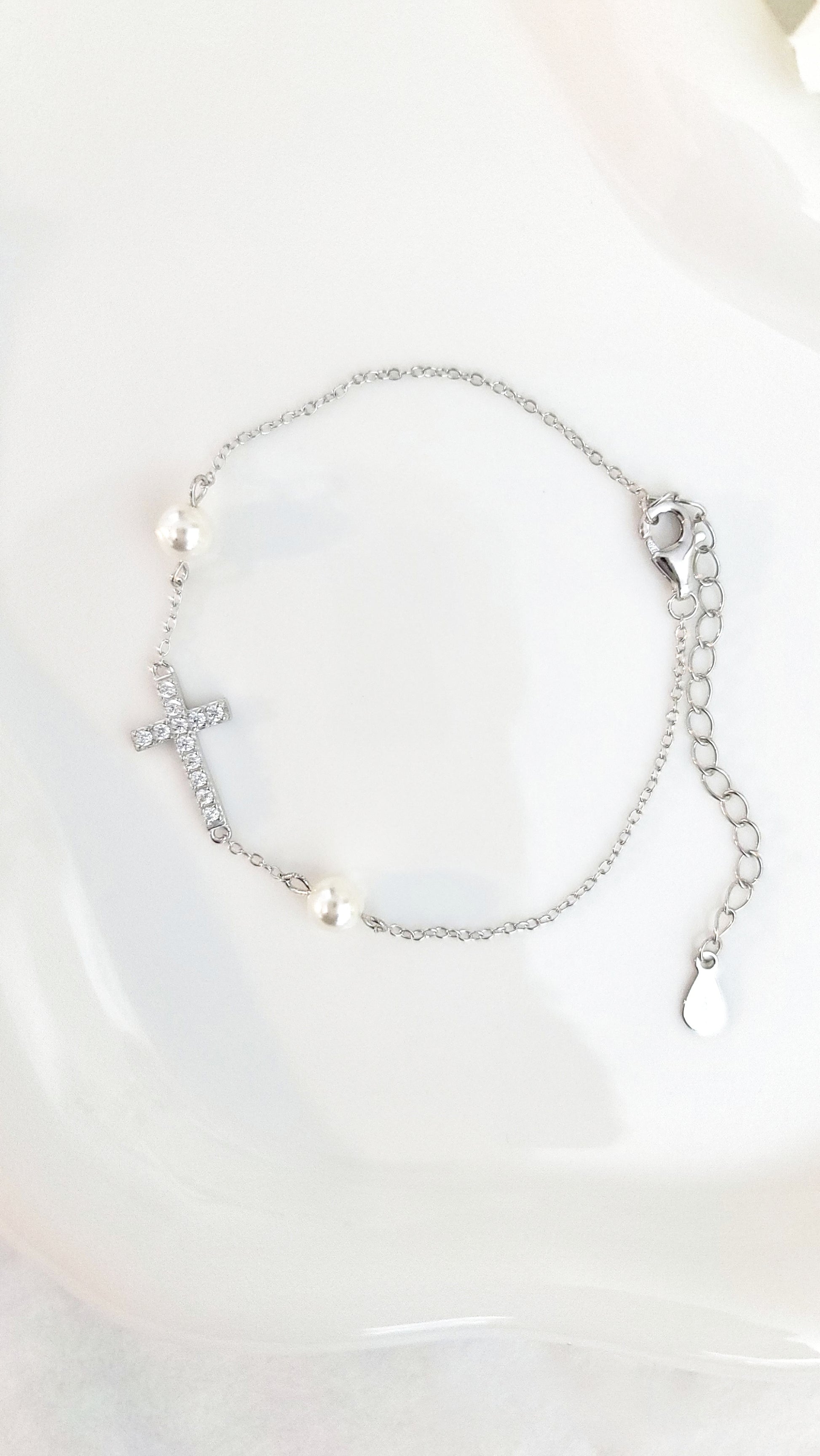 The GABRIELLA Pave Cross Bracelet is made of sterling silver with rhodium plating for extra shine and durability. Its sparkling pave cross design and pearls add a stylish element that complements any outfit, blending faith and fashion. Comfortable to wear and perfect for everyday or special occasions, this bracelet combines classic beauty with modern elegance.