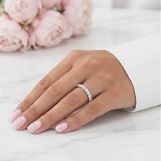Looking for a sparkling way to say "I do"? Our Jemima full eternity ring is crafted with high-quality sterling silver and rhodium plating, it is both durable and elegant. The sparkling cubic zirconia stones add a touch of luxury and brilliance. Whether as a symbol of your promise or a celebration of your forever, this ring is the perfect choice to make your engagement and marriage unforgettable.