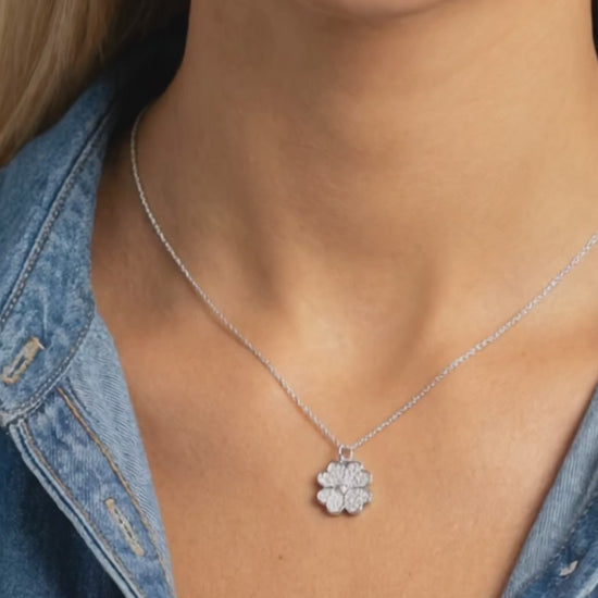 This heart shaped four-leaf clover leaf design, crafted in sterling silver and rhodium plated, adds a touch of elegance and simplicity to any outfit. Its timeless beauty makes it a perfect accessory for any occasion and a thoughtful gift for someone special.