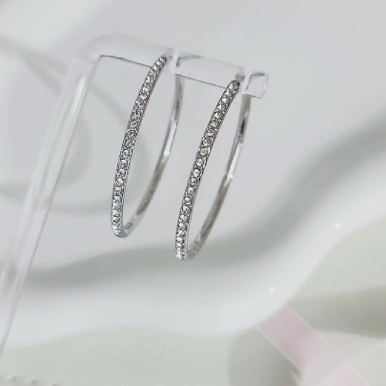 Add a touch of elegance and sophistication to any outfit with our Kayleigh 40mm Austrian crystal hoop earrings. Adorned with sparkling crystals from the renowned Swarovski brand, these earrings are the perfect statement piece for any outfit. The 18K white gold plating provides long-lasting shine and durability, giving these earrings long lasting sparkle and luster. Perfect for any occasion, these earrings are not just a fashion statement, but also a symbol of luxury and refined taste.