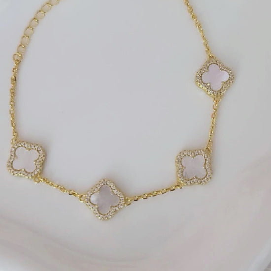 The LAURA Four-Leaf Clover Bracelet in 18K finish is a stunning accessory that combines elegant design with femininity. Crafted from sterling silver and plated with 18K gold, this bracelet features a delicate four-leaf clover adorned with brilliant cubic zirconia and a smooth white shell at its center. Comfortable to wear, it’s perfect for everyday elegance or special occasions. Whether worn alone or layered with other pieces, the LAURA bracelet makes a thoughtful gift or a stylish addition that brings style and grace to your jewelry collection.
