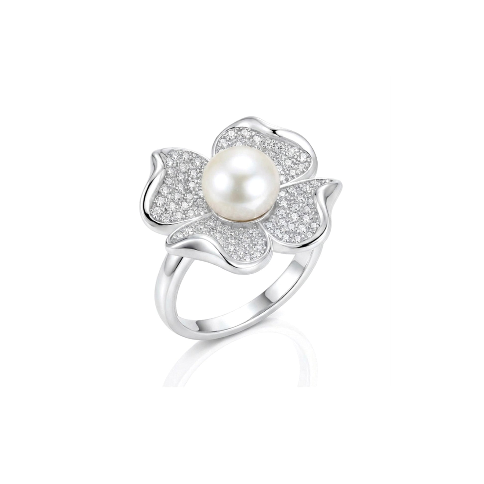 LILY Pearl And White CZ Diamond Flower Ring in Rhodium Over Sterling Silver