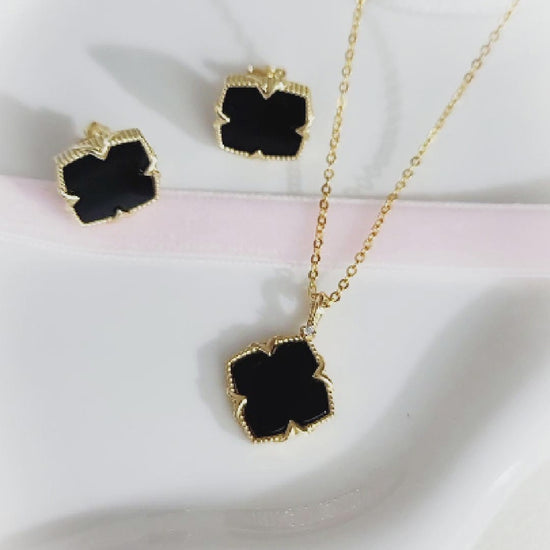 NICHOLE Black Onyx Four-Leaf Clover Earrings, Necklace Set in 14K Gold Over Sterling Silver