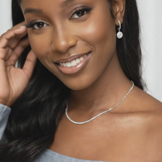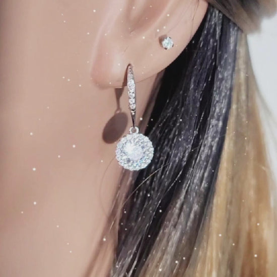 PRISCILLA White CZ Diamond Halo Round Drop Earrings in Rhodium Over Sterling Silver