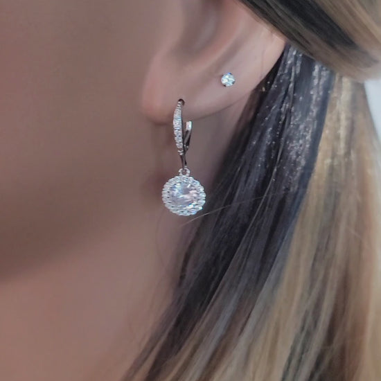 PRISCILLA White CZ Diamond Simulant Halo Round Drop Earrings in Rhodium Over Sterling Silver