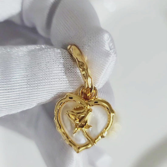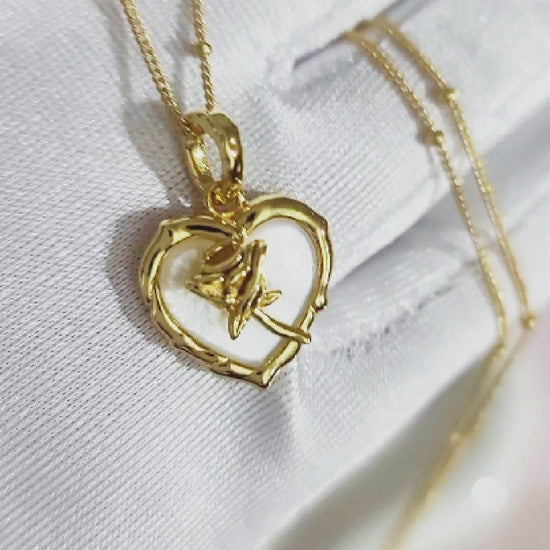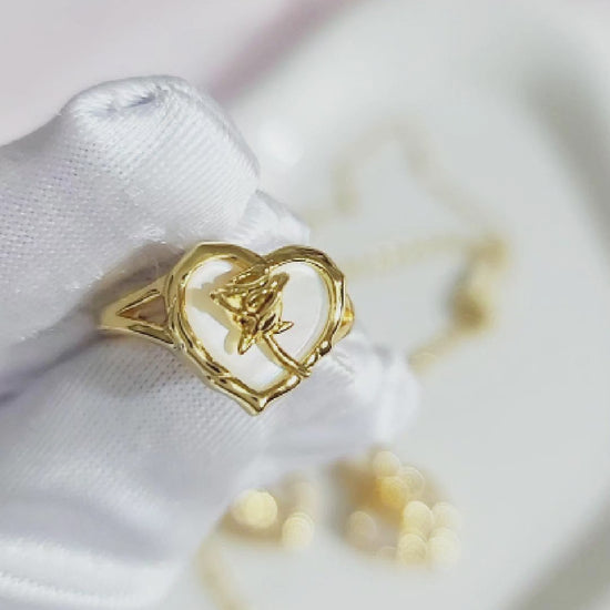 Transform any outfit into a statement with this gorgeous Rose 3-piece jewelry set featuring a chic, cultured Mother-Of-Pearl heart design with a delicate rose pattern in 18K gold plating. The matching earrings, pendant, and adjustable ring will add a touch of femininity to any outfit. Made of high-quality, sterling silver, this set is sure to catch the eye and make a statement. This set is perfect for any occasion, making it a versatile and essential addition to your collection. Exude femininity and sophistication with each wear!