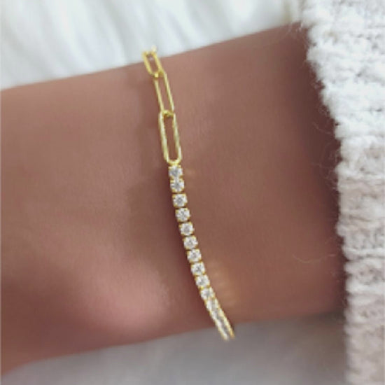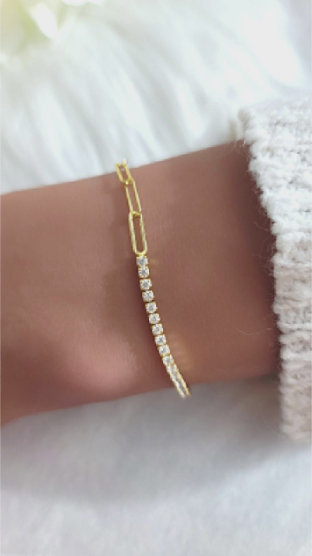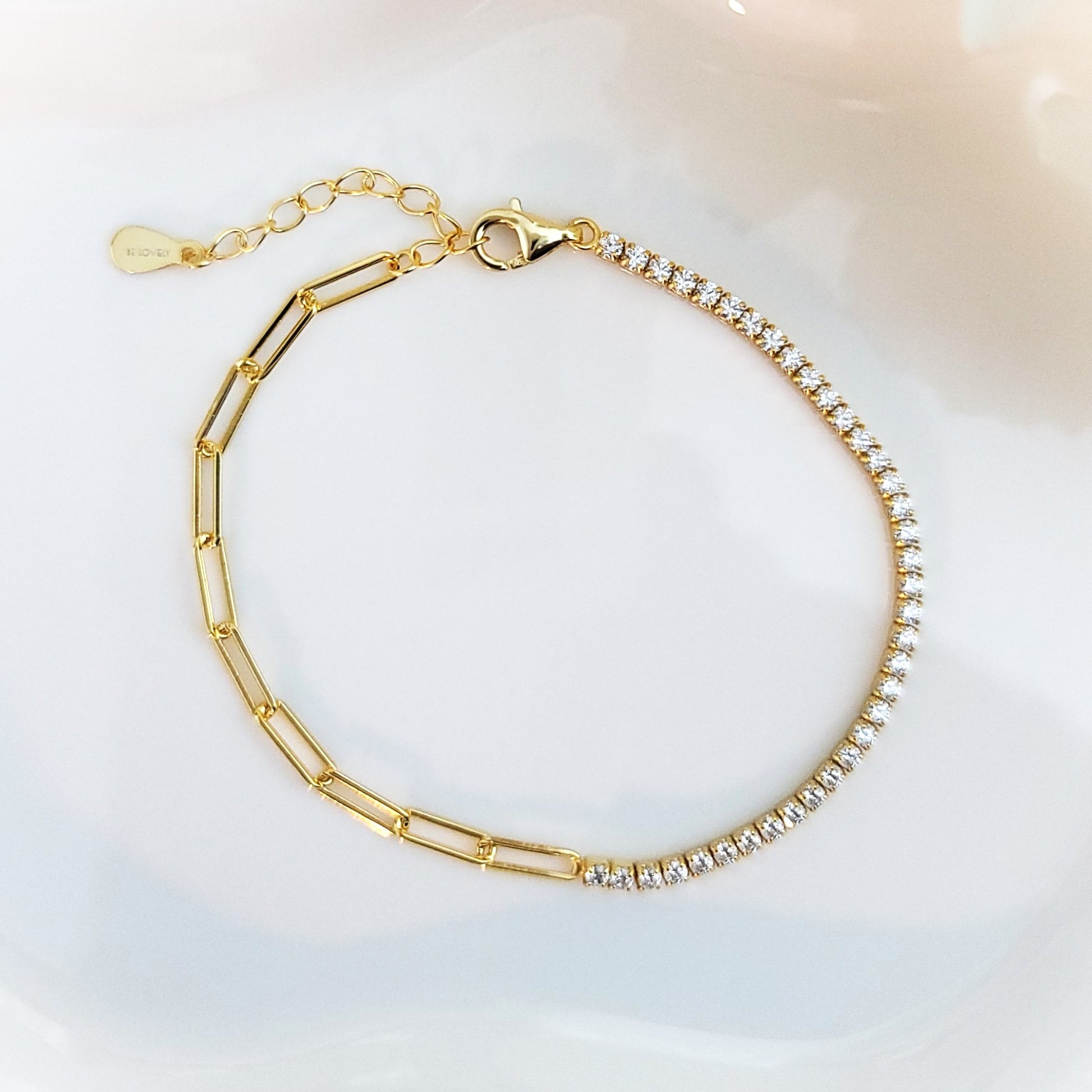 The SHANNON Tennis Paperclip Bracelet combines the sparkle of pave detailing with the modern edge of a paperclip design. Crafted from sterling silver and finished with 18K gold plating, this bracelet showcases timeless gemstones that bring a refined elegance to your ensemble. Perfect for elevating any outfit with subtle sophistication.