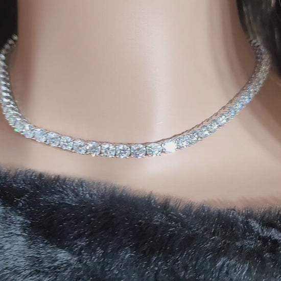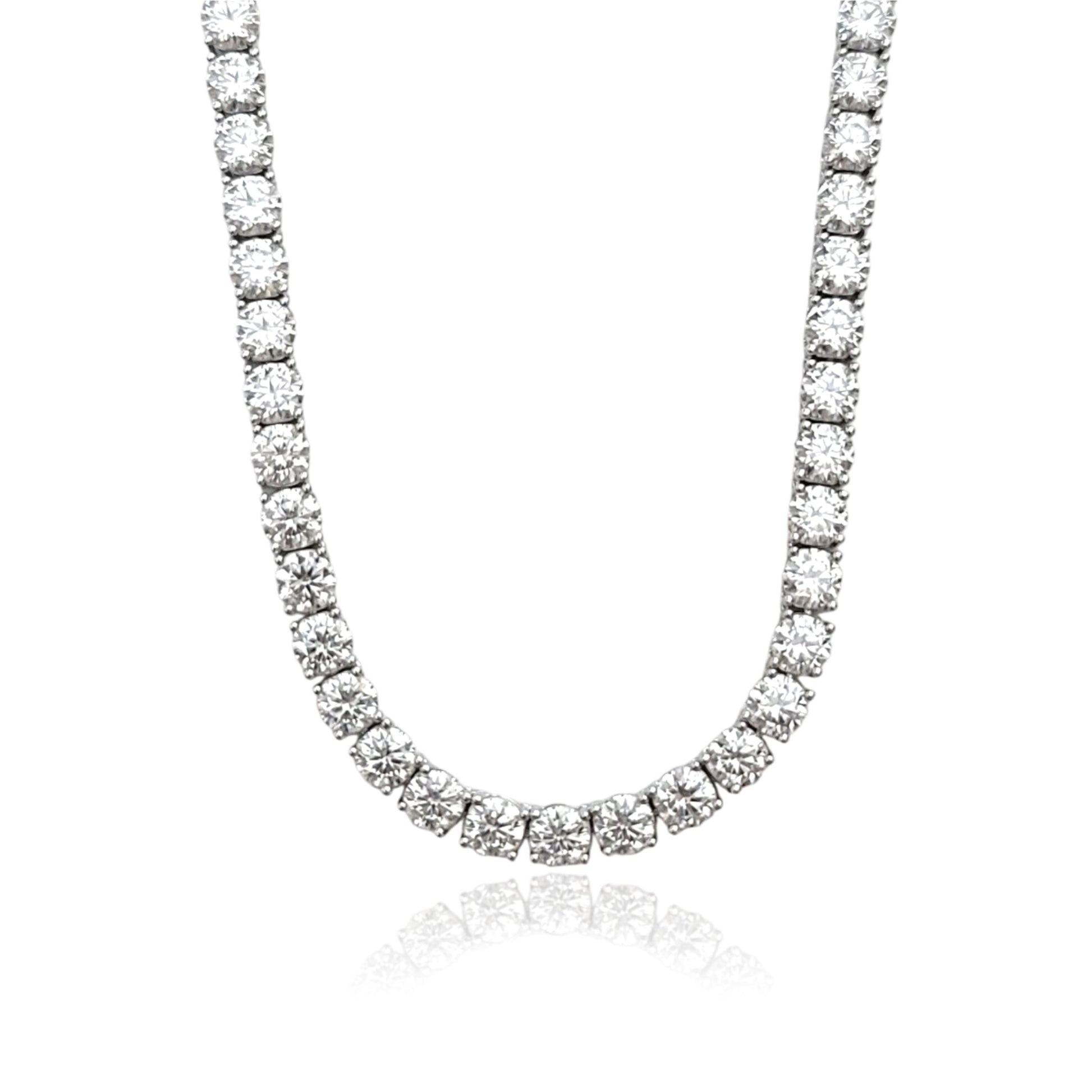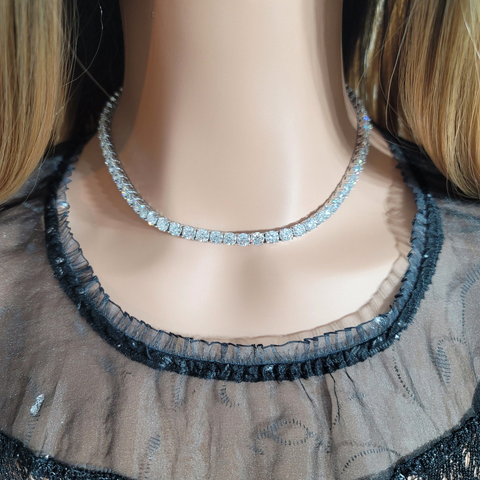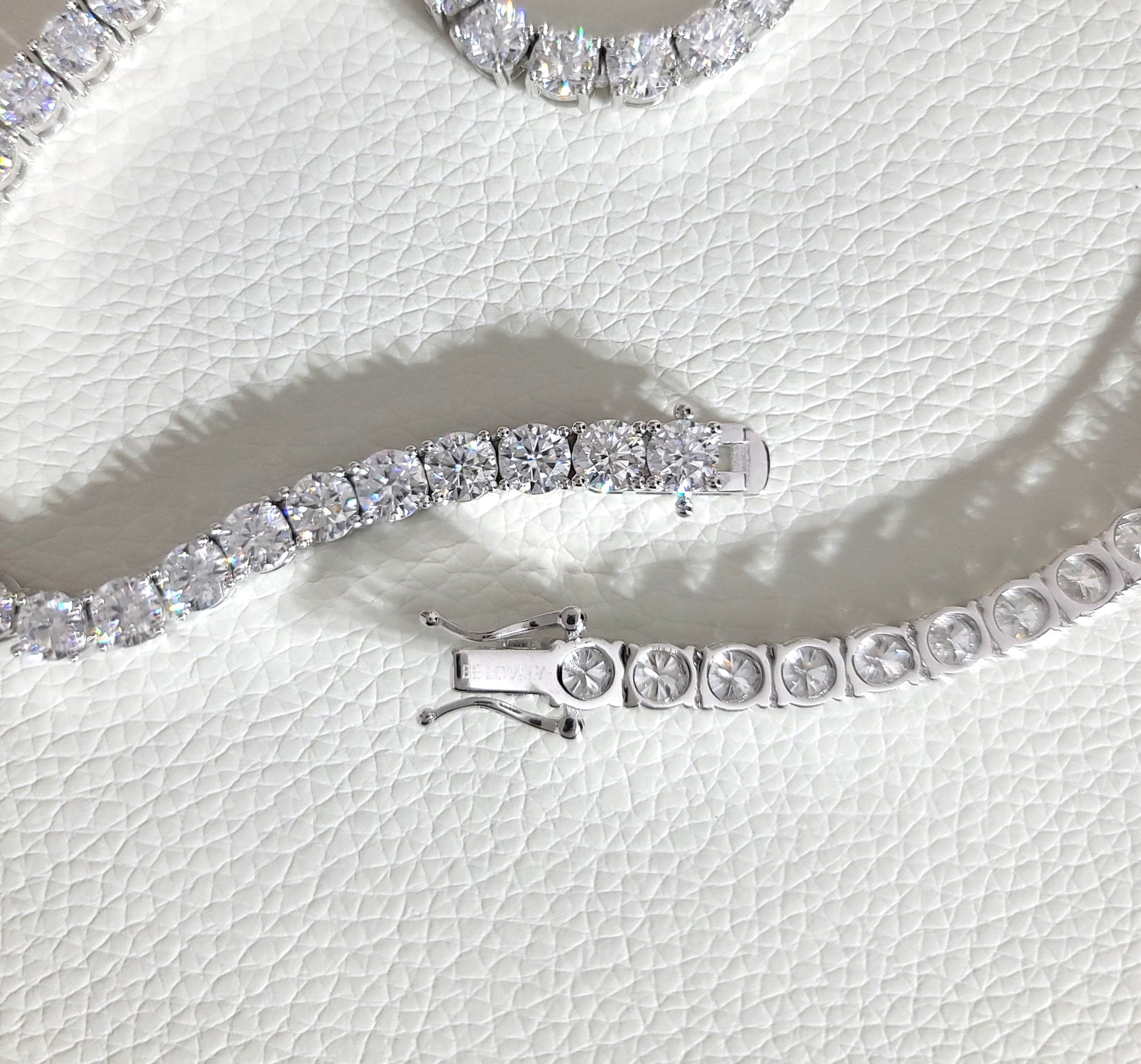 The SKY Moissanite tennis necklace features; 75 sparkling 0.5 ct round brilliant Moissanite stones known for their exceptional clarity, sparkle and fiery brilliance. Cherished for its extraordinary beauty, and as an affordable yet striking alternative to diamonds, Moissanite offers outstanding brilliance and durability close to that of diamonds that makes it suitable for everyday wear. With its luminous beauty and timeless elegance, this high-quality necklace is a refined accessory designed to captivate and enhance any style with beauty and grace.