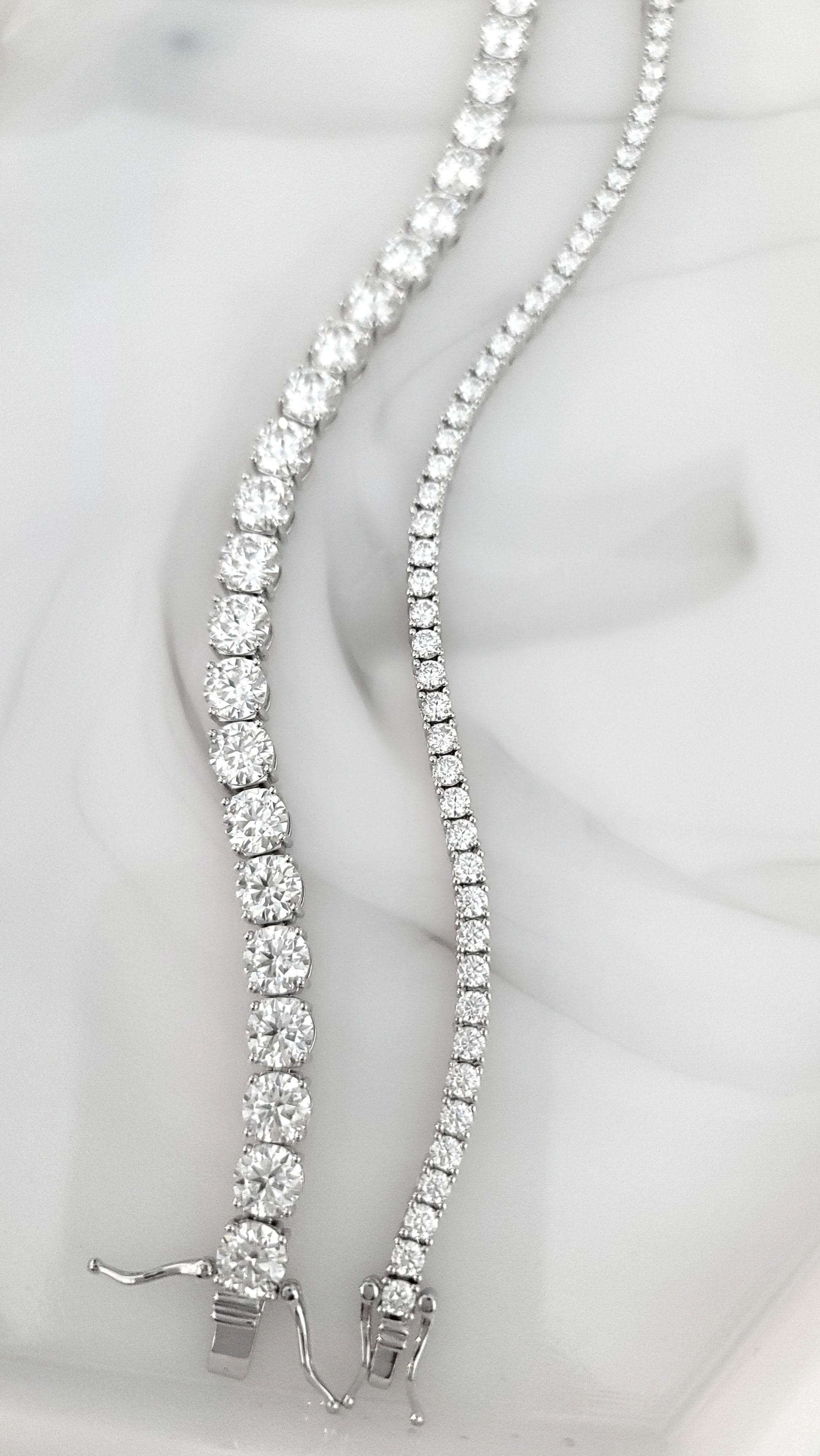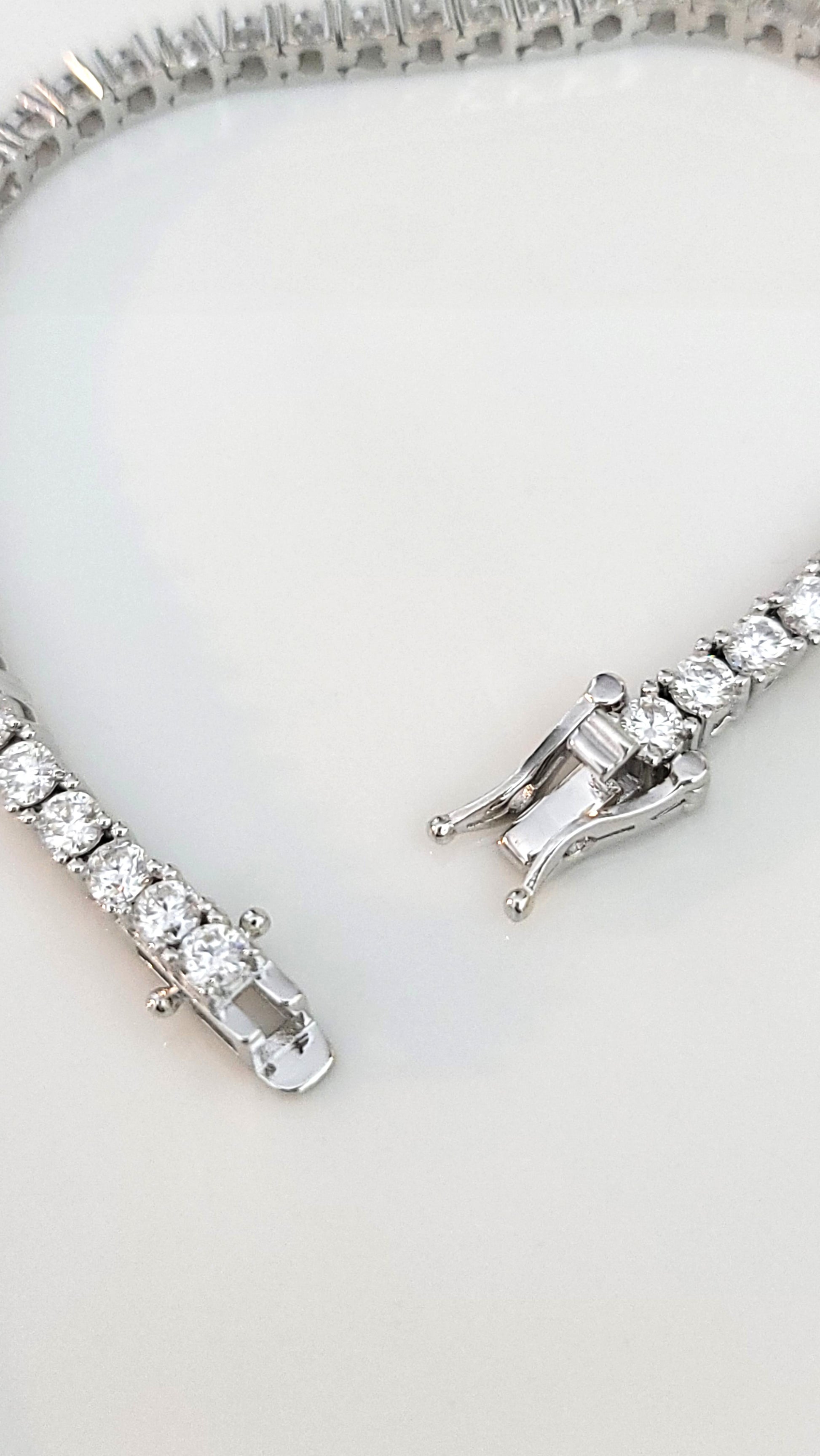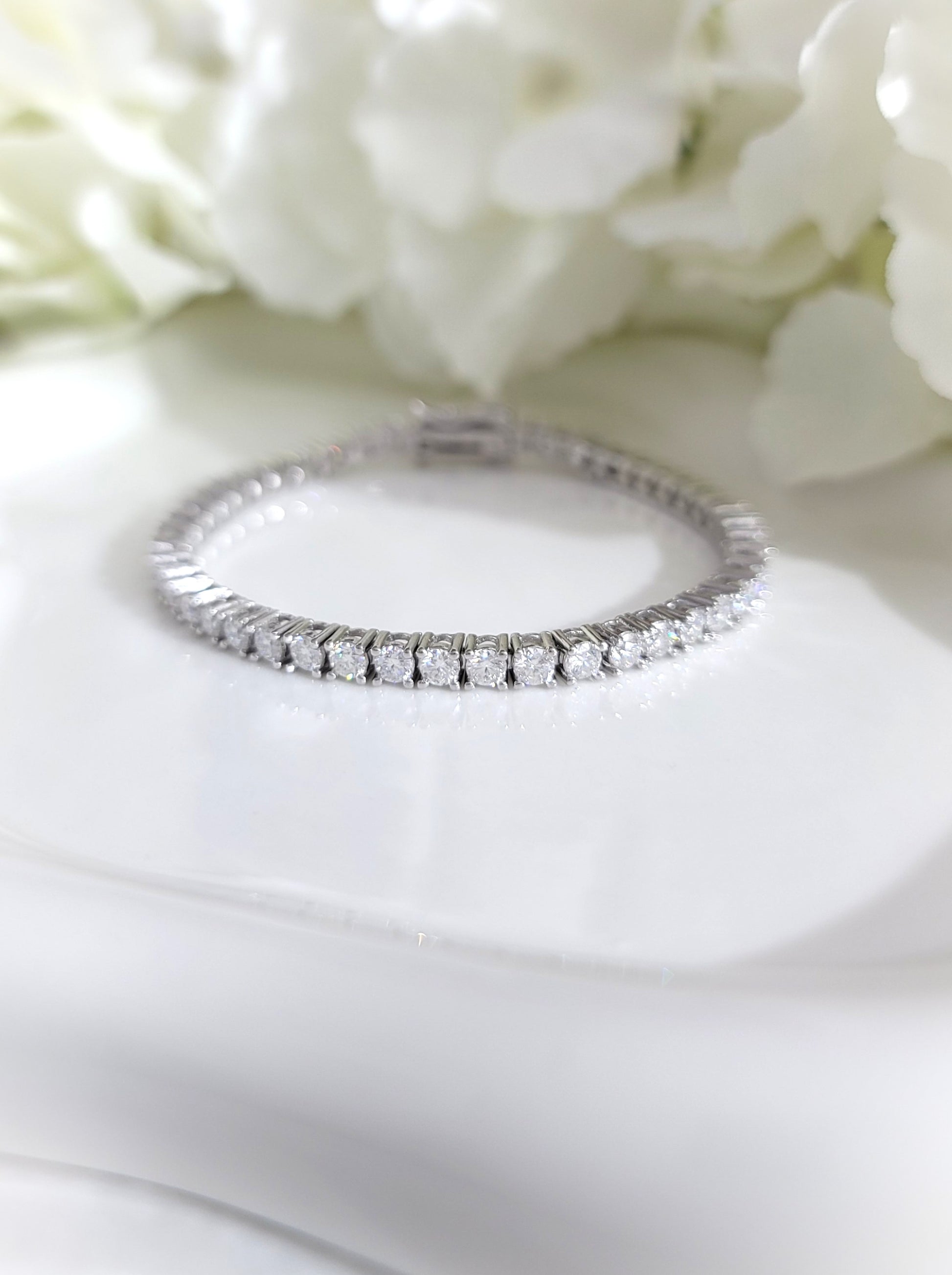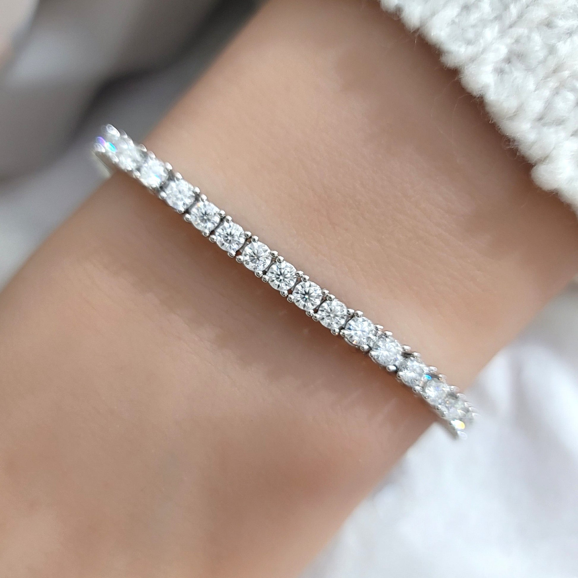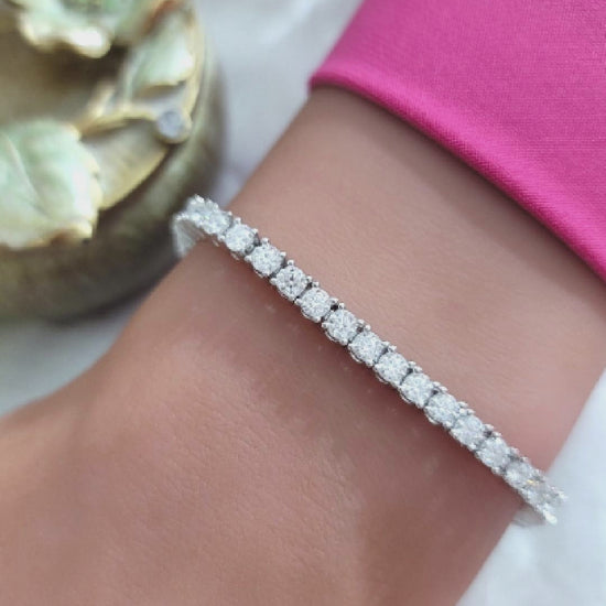 The STELLA Moissanite Tennis Bracelet features 48 sparkling 0.1 ct round brilliant Moissanite stones known for their exceptional clarity, sparkle and fiery brilliance. Cherished for its extraordinary beauty, and as an affordable yet striking alternative to diamonds, Moissanite offers outstanding brilliance and durability close to that of diamonds that makes it suitable for everyday wear. With its luminous beauty and timeless elegance, this high-quality bracelet is a refined accessory designed to captivate and enhance any style with beauty and grace.